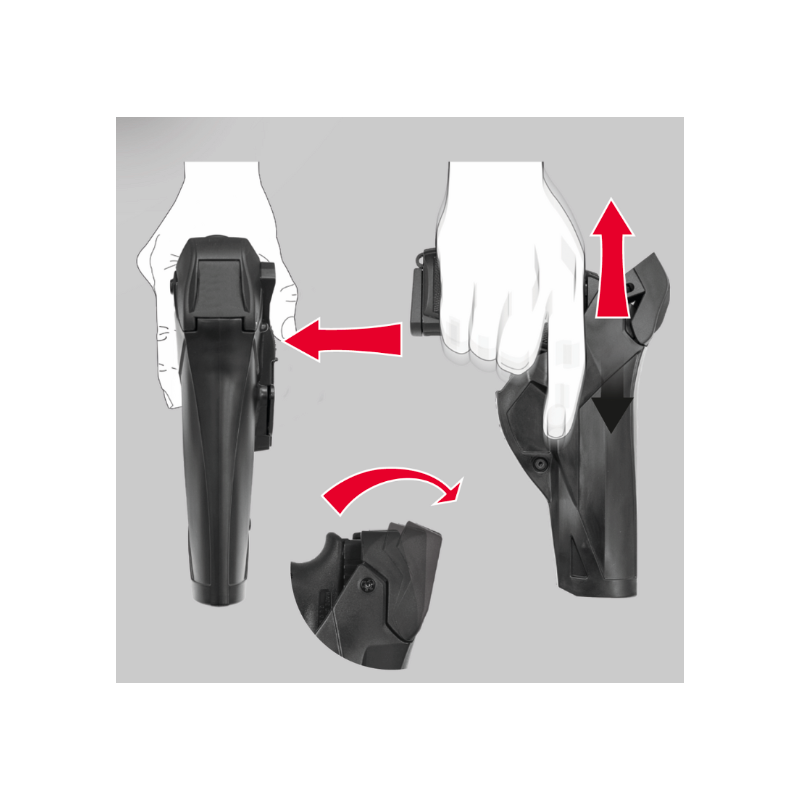 Per lo sgancio di entrambi i sistemi di sicurezza si agisce sullo stesso pulsante posto nella parte interna della fondina.