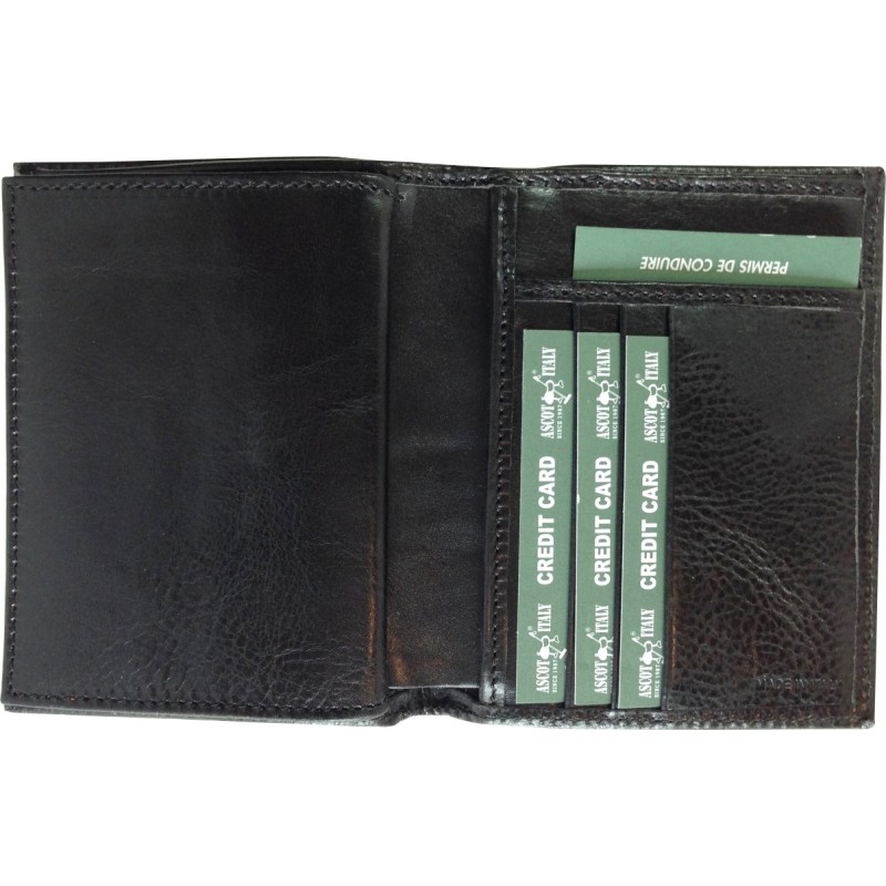 Portafoglio Ascot verticale in vera pelle pieno fiore con porta tesserino e porta placca occultabile dietro uno scomparto porta carte di credito.