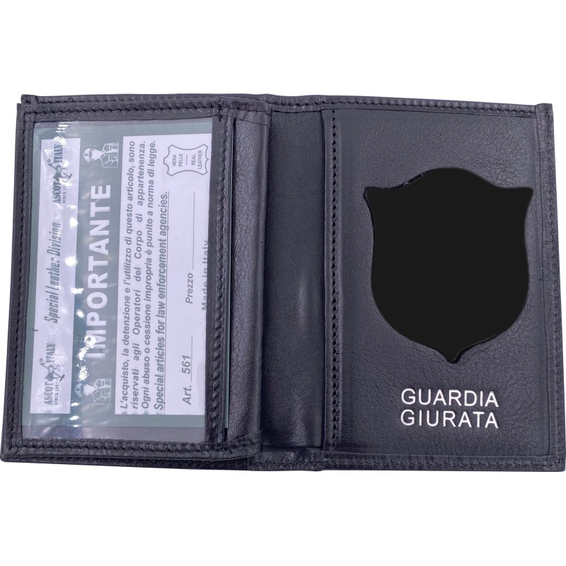 Portafoglio Ascot verticale in vera pelle pieno fiore con porta tesserino e porta placca occultabile dietro uno scomparto porta carte di credito. Grazie allo scomparto che copre placca e tesserino risulta idoneo per l'uso di tutti i giorni, rendendolo adatto per identificarsi solo al bisogno. La placca può essere inserita e rimossa al bisogno. Portafoglio realizzato per una grande resistenza all'uso.